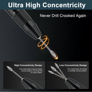 Dank seines hochkonzentrischen Designs bietet der elektrische Schleifer S2 unübertroffene Stabilität und Präzision. Er garantiert eine genaue Ausrichtung sowohl bei detaillierten Bohrarbeiten als auch bei komplizierten Schnitzarbeiten und gewährleistet eine einwandfreie Ausführung ohne Abweichungen.