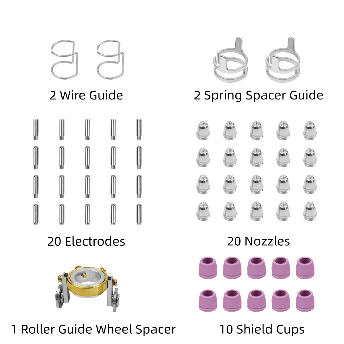 Package Includes: 1 roller guide wheel spacer, 2 wire guide, 2 spring spacer guide, 10 shield cup, 20 nozzles, 20 electrodes.